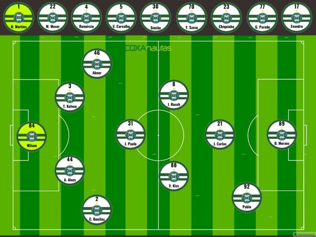 Coritiba: Wilson; Cesar Benitez, Thalisson Kelven, Alex Alves e Abner; João Paulo, Vinicius Kiss, Julio Rusch e Jean Carlos; Pablo e Bruno Moraes
