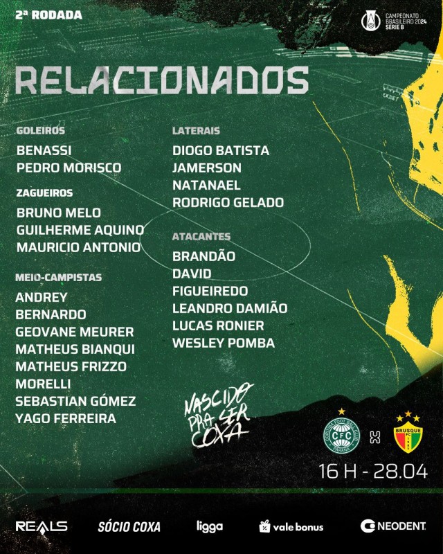 A lista de relacionados do Coritiba para a partida contra o Brusque, que acontece neste domingo no Alto da Glória, conta com desfalques, retornos e também uma novidade, a presença do meia Yago Ferreira, convocado pela primeira vez pelo técnico Guto Ferreira.