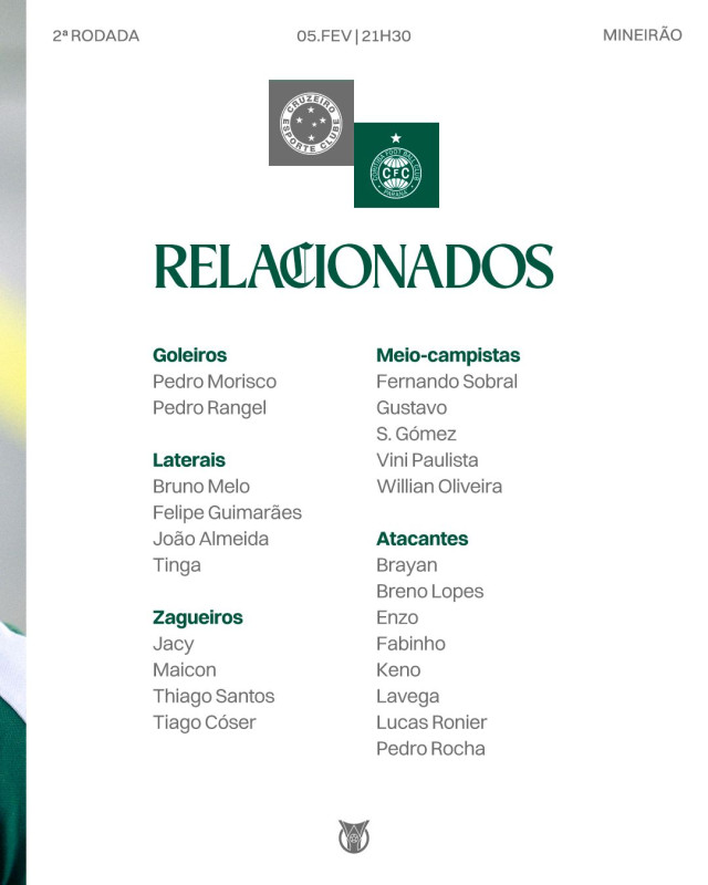 O Coritiba divulgou a lista de jogadores relacionados para a partida contra o Cruzeiro, válida pela 2ª rodada, que acontece nesta quinta-feira (05), às 21h30, no Mineirão.
