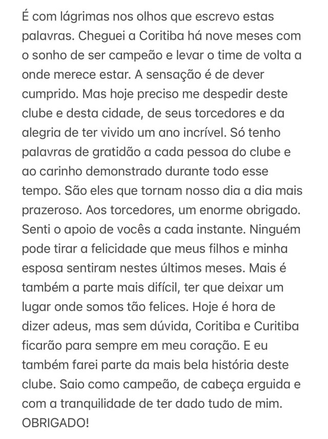 O jogador se despediu com uma mensagem de gratidão pela oportunidade de vestir a camisa do Coritiba.