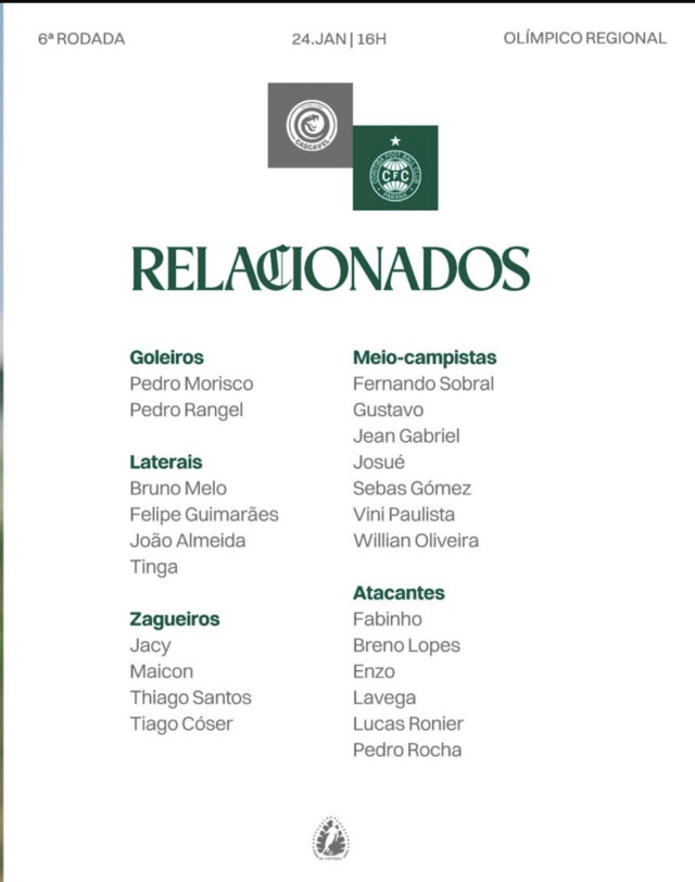 O Coritiba divulgou a lista de relacionados para o confronto diante do FC Cascavel, neste sábado (24), às 16h, no Estádio Olímpico Regional, pela sexta rodada do Campeonato Paranaense.