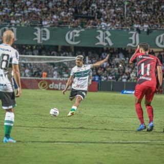 Aos 24 minutos, Alef Manga bate forte de fora da área e Santos defende. No minuto