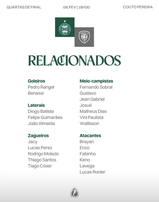Alguns atletas que estiveram em campo na vitória do Coritiba sobre o Cruzeiro, pelo Brasileirão, ficaram fora da lista para este compromisso estadual. A ideia da comissão técnica é equilibrar o elenco, preservando peças importantes sem perder competitividade.